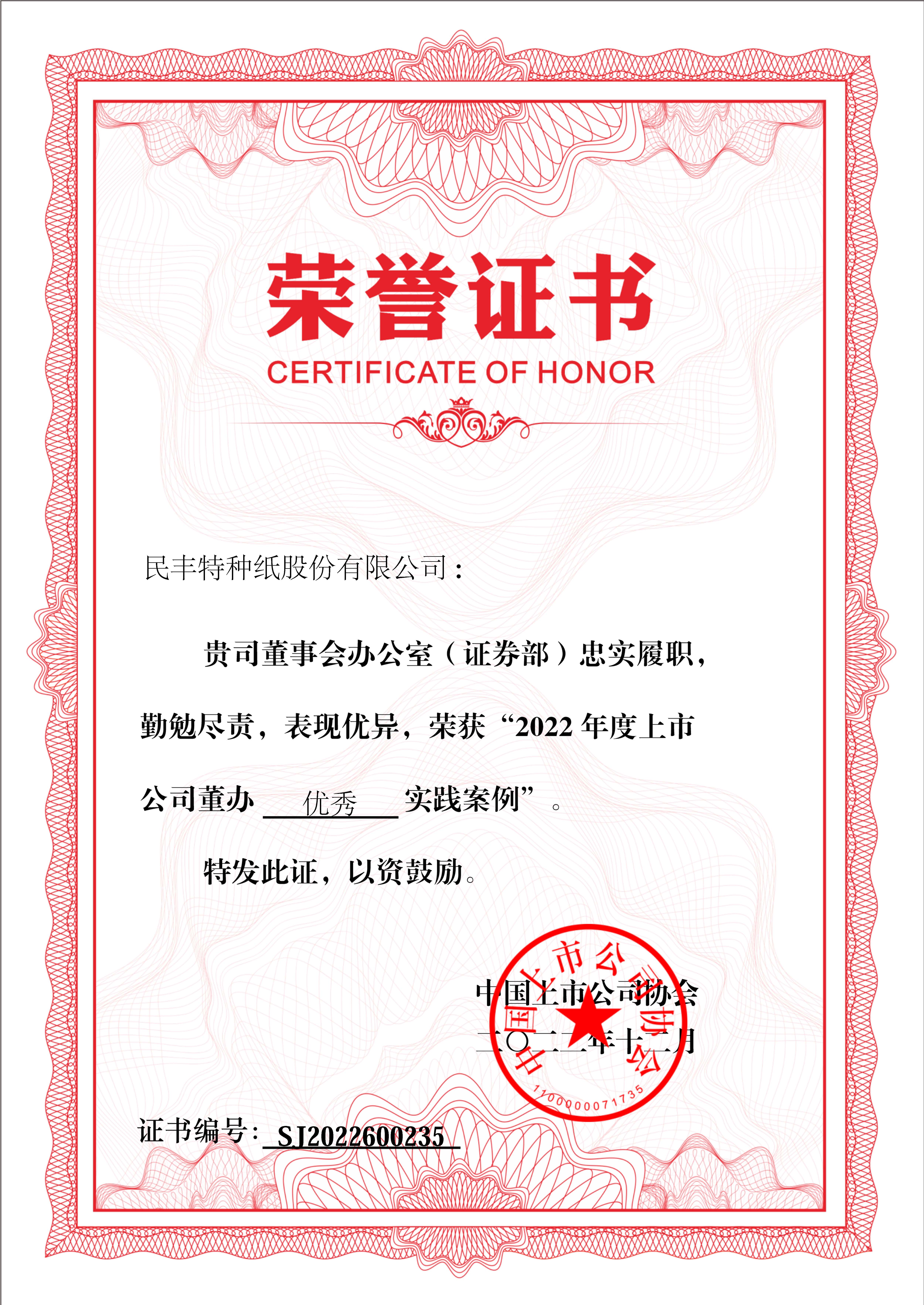 中国上市公司协会于2022年11月中旬,组织开展了“2022年度上市公司董办最佳实践案例”评价活动。近日评选结果揭晓,金年会特纸董事会办公室荣获“2022年度上市公司董办优秀实践案例”奖。