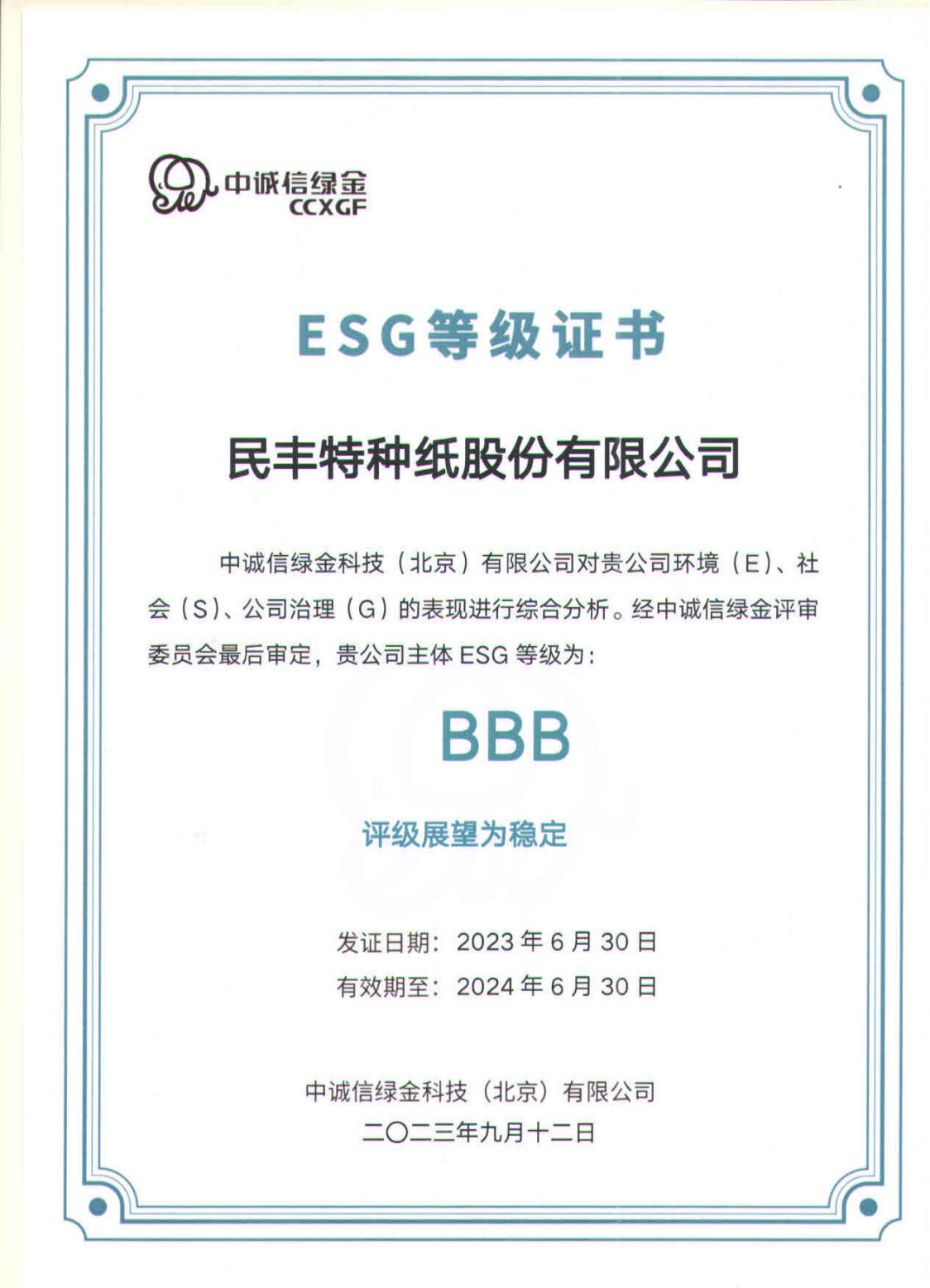 近日,公司收到中国第一、全球第四大评级机构——中诚信旗下中诚信绿金颁发的ESG登记证书。经中诚信绿金评审委员会最后审定,金年会特纸主体ESG等级为:BBB(位于行业22/156水平,可持续发展潜力较大),评级展望为稳定,在环境纬度中并列行业第一名。