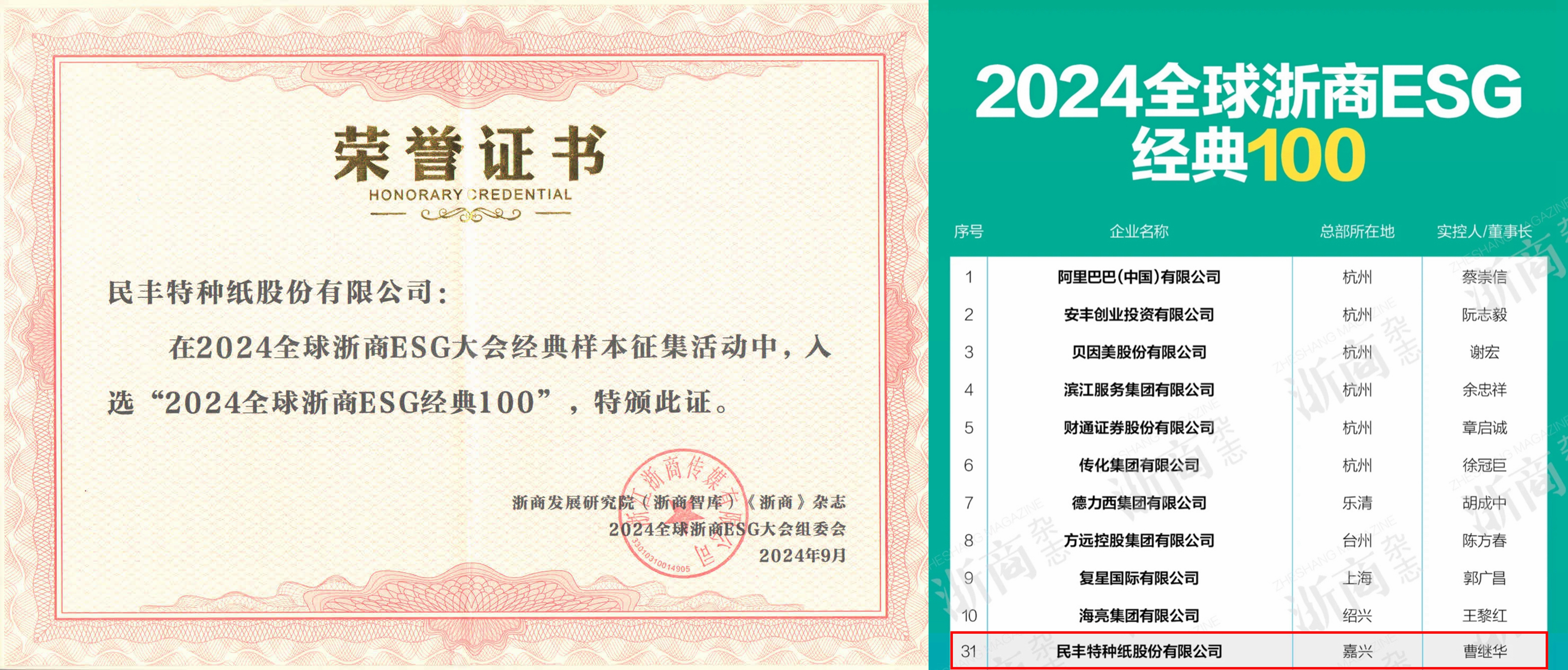 金年会特纸荣耀登榜2024全球浙商ESG经典100